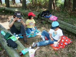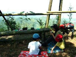 展望台から,少し歩くと,山頂に着く。山頂は眺めはよくない。しかし,ここにも,座って憩うことができるようにか板敷きがセットしてあった。眺めがよい展望台でお昼にした。