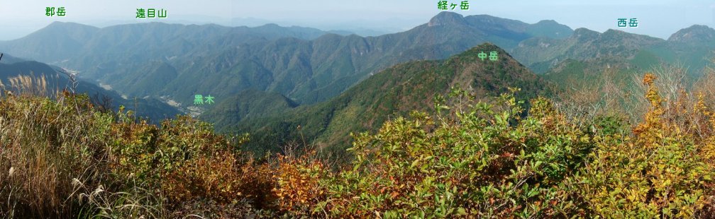 郡岳西登山口〜1時間5分〜郡岳〜1時間10分〜遠目山〜1時間5分〜岩屋越〜1時間50分〜経ヶ岳〜1時間20分〜金泉寺〜1時間25分〜五家原岳〜1時間35分〜黒木八丁林道駐車場
