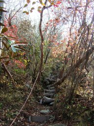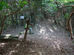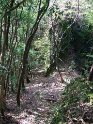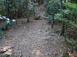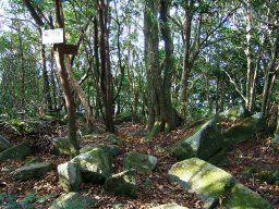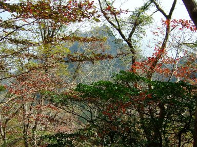 大きな岩が見えだし,その岩をぬうように登ると,遠目山山頂である。しばし,休憩して,先を急ぐ。遠目山から岩屋越までは,直角に曲がらなければならない場所もあり,地図を見ながらしっかりルートを確認して進む必要がある。岩屋越に近づくと,岩尾根を通ったり,アップダウンがすこしきつくなる。しかし,木々に包まれたおとぎ話の中のような道と小鳥の声は心を癒してくれる。