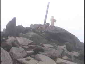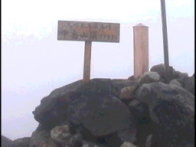 久住分かれに着くと,こんな天気にも関わらずたくさんの人が休憩していた。上には上がいるもんだ。しばらくの急な斜面を上がると久住山山頂らしきところへ。(だってまわりが何も見えず,木の板を見て,頂上かなと思った(笑)) 霧の中いてもしょうがないので,中岳へ。御池の渕を通り,やがて中岳へ。中岳の頂上近くは,「晴れていれば,いい眺めだろう」と思わせる斜面だった。