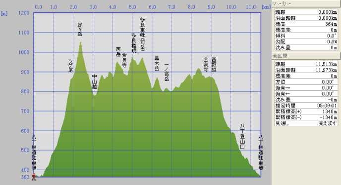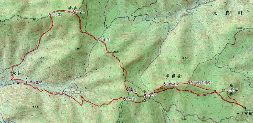 八丁林道駐車場〜ツゲ尾〜経ヶ岳〜西岳〜多良権現〜多良岳(東峰)〜六地蔵から一宮岳への道〜黒木岳〜六体地蔵から一宮岳への道〜一ノ宮岳〜六地蔵〜金泉寺〜八丁林道登山口〜八丁林道駐車場