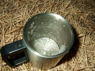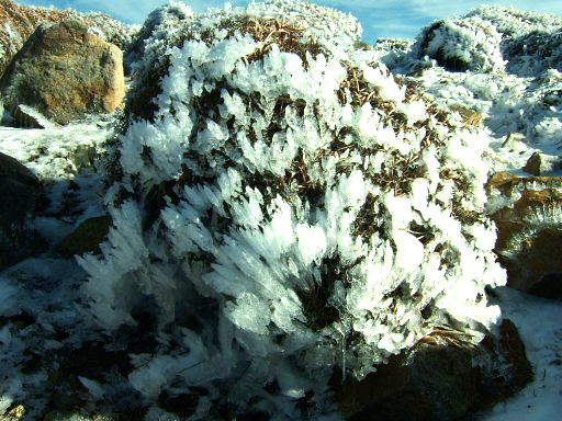 朝5時半に起きてみると、テントの外側はばりばりに凍っている。さて朝の紅茶を飲もうと水の入ったペットボトルを取り出す。気温が低くて水が凍ってしまうのを心配して、魔法瓶への水も用意していたが、その必要はなかったようだ。しかし、ペットボトルのフタを空けて、外気にさらした瞬間、