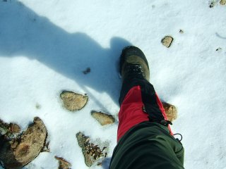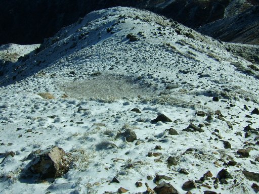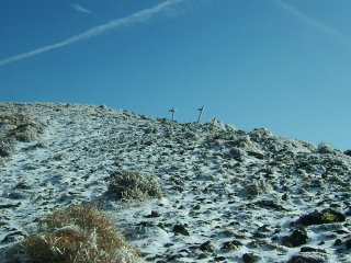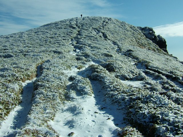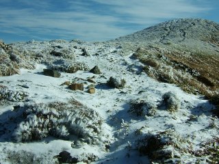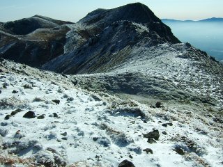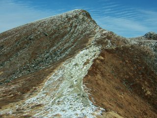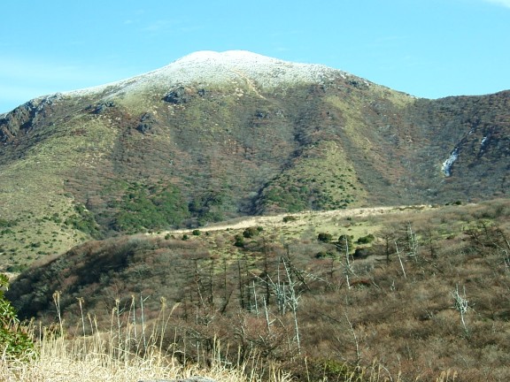 星生山が見えてきた。頭の部分が白くなっている。ちょっど、白い帽子をちょこんとのせたようである。星生山から久住分かれに向かう岩場が凍っていそうでどうしようかと思ったが、アイゼンもあるし、せっかくの白い雪を踏んでみない手はない。