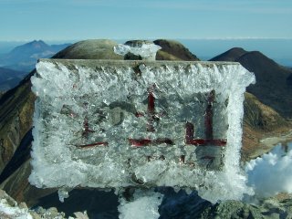 星生山山頂。山頂標識も凍りついていた。