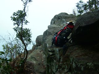 舞岳のお気に入りの展望岩で小休止。まだ多良の峰はガスの中で、かすかにシルエットを見せてくれる程度である。