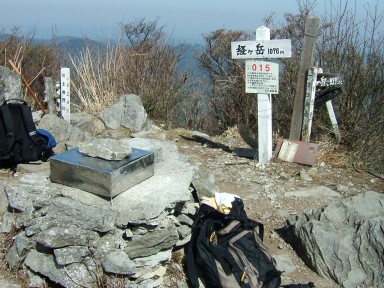 冬場は荷物が多く35リットルのザックで登っていたが,今日はすぐ降りることもあり,ホームセンターで見つけた1400円の小さなザックで行った。荷物が少ないせいもあるが軽い軽い。思わずペースは上がる一方。俺,こんなに早くて大丈夫か。大払谷の石ごろごろに来ると,やっぱりばててきた。(笑) 経ヶ岳をなめてはいかん。いつものペースに戻して,つげ尾から頂上へ。