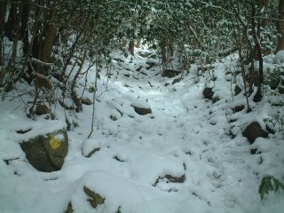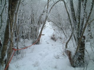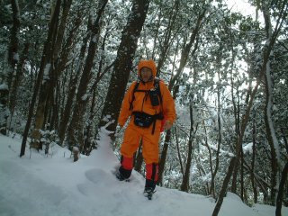 今回は,木々から落ちてくる雪の粉にそなえて,買って半年,初めてレインスーツを上下につけて登ることにした。いつもの道をてくてくと登る。舗装路から雪が積もっている。頂上付近はいかほどか。