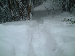 さあ,舞岳への下りだ。下り道を見てみると,ギョギョッ,この雪をかき分けて下りるの?ちょっとびびる。