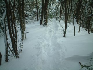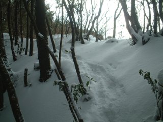 雪に悪戦苦闘していると,一人の女性の年輩の方が単独で登ってこられた。ええっ,この道を女性で単独・・・ わが県の山女もすごい。