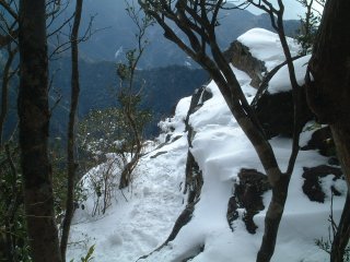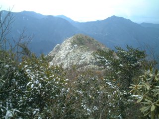 大払谷に入ると,雪が深くなってきた。いつも手をかける岩は,雪がのっていて,手のかけどろこがない。途中,5人のグループを追い抜いた。で,暑さにスーツを脱いでいると,抜かれた。で,また抜いた。抜かれた後に,道を空けてもらうのが申し訳なく,アイゼンをつけたいのだが,そうするとまた繰り返しになってしまう。アイゼンなしで登り続けた。結局,アイゼンをつけている間にまた抜かれた。もう,抜くのをやめようと決心し,ゆっくりゆっくりツゲ尾まで登る。ツゲ尾から頂上までは雪が深く美しかった。いつもの道が全然別物に見える。