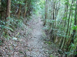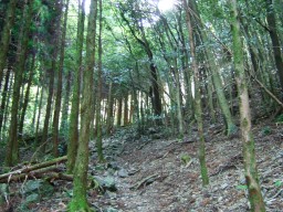 平谷から出発。平谷キャンプ場の看板のところに詳しい案内がある。看板のところから山道に入る。横に沢の音を聞きながらの静かな道だ。多良山系らしいごづこつの石ころ道と木漏れ日の細い道が続く。ところどころに土石流止めの堤防がある。しばらく登ると,いったん砂利道の林道に出た。林道からまた山道に入る。植林帯をぬって登っていくと,馬の背峠に着いた。