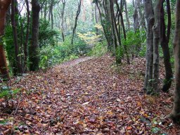 落ち葉を踏み踏みたどる道。笹岳の横の黄色い彩りが輝いて見えた。