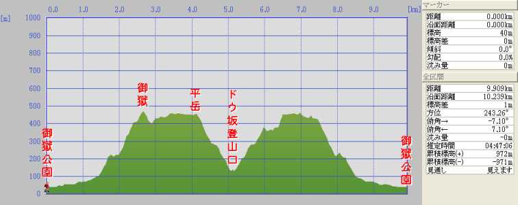 | 御嶽〜平岳 御嶽公園〜20分〜林道終点〜30分〜式内社島多国魂神社(お堂)〜5分〜平岳縦走路分岐〜10分〜御嶽〜45分〜平岳〜15分〜登山道〜20分〜ドウ坂峠登山口〜50分〜平岳・御嶽分岐〜30分〜式内社島多国魂神社(お堂)〜25分〜林道終点〜20分〜御嶽公園 断面図 |