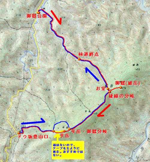 | 御嶽〜平岳 御嶽公園〜20分〜林道終点〜30分〜式内社島多国魂神社(お堂)〜5分〜平岳縦走路分岐〜10分〜御嶽〜45分〜平岳〜(この間不明瞭)15分〜登山道〜20分〜ドウ坂峠登山口〜50分〜平岳・御嶽分岐〜30分〜式内社島多国魂神社(お堂)〜25分〜林道終点〜20分〜御嶽公園 (平岳から登山道に出るまでの道は、テープがなくなり不明瞭となっている)(2013年1月現在) 概念図 |