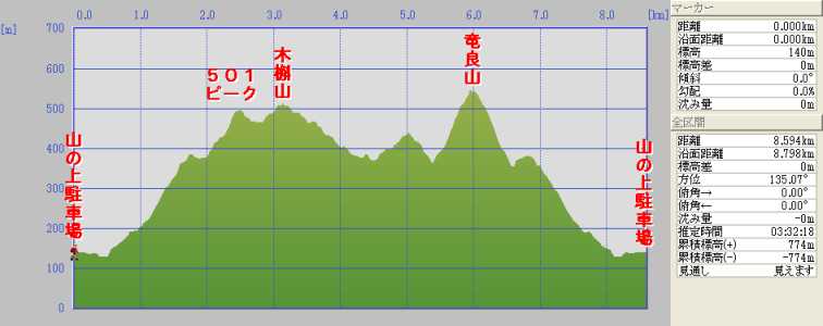 | 木槲山(もっこくやま)〜龍良山(たてらさん)(竜良山) 山の上駐車場〜1分〜西竜良林道入り口〜10分〜登山口〜10分〜スダジイの巨木〜30分〜竜良山・木槲山・浅藻分岐〜25分〜501P〜20分〜木槲山〜15分〜車道からの分岐〜25分〜竜良山・木槲山・浅藻分岐〜20分〜竜良山〜15分〜竜良山・木槲山・浅藻分岐〜40分〜登山口〜10分〜山の上駐車場 断面図 |