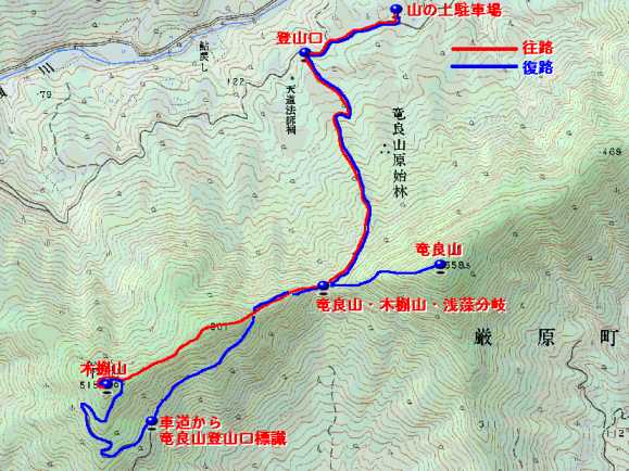 | 木槲山(もっこくやま)〜龍良山(たてらさん)(竜良山) 山の上駐車場〜1分〜西竜良林道入り口〜10分〜登山口〜10分〜スダジイの巨木〜30分〜竜良山・木槲山・浅藻分岐〜25分〜501P〜20分〜木槲山〜15分〜車道からの分岐〜25分〜竜良山・木槲山・浅藻分岐〜20分〜竜良山〜15分〜竜良山・木槲山・浅藻分岐〜40分〜登山口〜10分〜山の上駐車場 概念図 |
