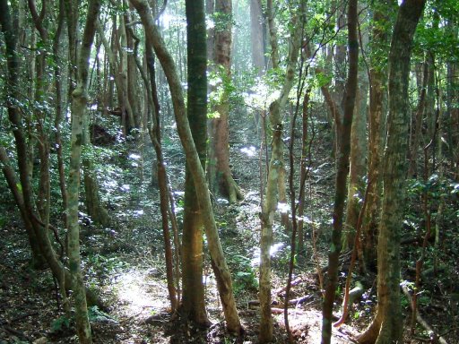 山の上駐車場から竜良山の登山口へ広い道を歩き出す。車も通る道だが、木々の葉かげから射す光はやわらかく地面を照らしていて、この山の豊かさをすでに感じ始めている。登山口から照葉樹林の中に入ると、原始の世界。鬱蒼とした木立の中にこの森の輪廻を感じ取り、太古からの営みが目に浮かぶようである。スダジイの巨木の前でで一息ついて、この木の昔の記憶に思いを馳せる。少し休憩して、登りに入った。