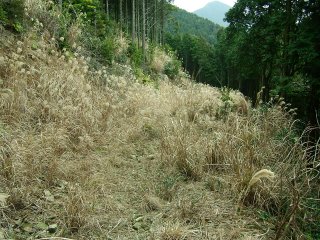 歩き出すと、両サイドをススキに覆われ、なんとも不気味な雰囲気である。しかし、もともとは舗装していない林道のようで、道は明るく歩きやすい。15分くらい歩くと、山道に入ることとなった。そして、ここからものの5分ほどで先ほど木槲山を目指してたどってきた稜線に出ることになった。この道からたどると、木槲山と竜良山の分岐点までは、尾根の左右をぬいながら歩くわかりやすく道があった。