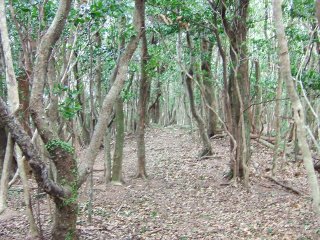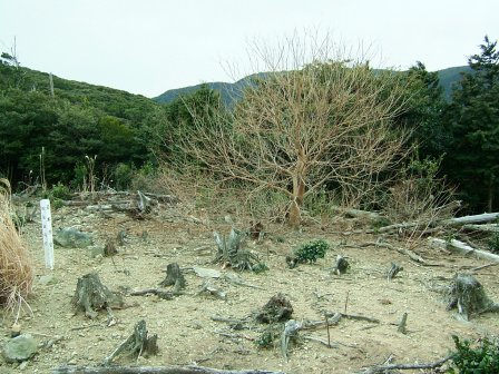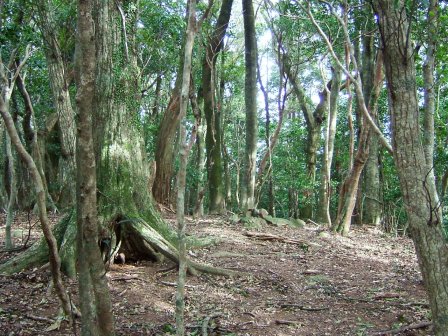 標識のある分岐点を過ぎ、成相山への道へと分け入る。最初の数十メートルは立派な道のようなので、この先も道が続いているのではと思って踏み跡をたどると、とても細い道となった。この細い道は北西側の山腹をたどっていく道のようである。行けるだけ行ってみようと歩いていくが、狭い狭い。途中から、尾根伝いに歩くやぶ道の中に突入することにした。尾根を意識しながら歩いていくと、意外に赤テープがいくつかある。なるべく枝に叩かれないように、ルートを選びながら上へ上へと足を進める。対馬の北西の強い風がようしゃなく吹き付ける。林の中にあってもその迫力は壮絶だ。たかが風であるが、その音と迫力は恐怖感を感じざるを得ない。なんとなく、一人で大丈夫やろかと不安にさせる風である。そんな不安な気持ちの折も折、目の前20mのところをイノシシが猛ダッシュ!「こっち来んな!」と心で願いながら、その後は、人間の存在に気づかせるために声をかけながら歩く。これだけ風があるのだから、人一人の足音など風で消されているだろうに、野生の動物はその気配に気づくからすごい。