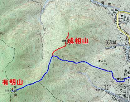 青い線は有明山への登山道。赤い線は道はないが、成相山へのルートである。