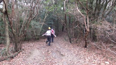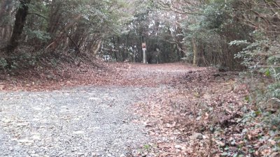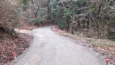 林道は、舗装路を過ぎ、工事中の未舗装路、そして工事の手がついていない未舗装路、そして舗装路へと変化し、ほとんど林道歩きの終点が椎原峠(西)である。ここで、休憩でもしないとすぐ着いてしまうぞと妻と娘に話すが、身体が冷えるのでそのまま歩くという。