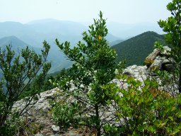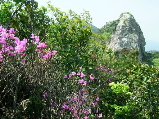 白嶽登山口に着き,身支度をし,出発する。今日は少し霞みががっていて遠望は望めそうにないが,いい天気である。いつものように鳥のさえずりを心地よく耳にしながら,白嶽を目指す。西岩峰に近づくとツツジがあちこちに咲いている。このツツジ,岩肌との風景に実にマッチしている。