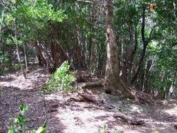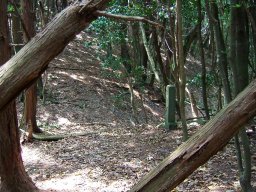稜線沿いを行けばよいと思い,ここまでコンパスと地図をセットしていなかった。現在地点がはっきりわからない。ただ,進行方向を見ると,三角点から南東に伸びる枝尾根に入ってしまっているようだ。