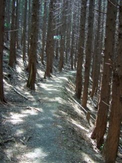 植林地帯と自然林地帯が交互に訪れ,同じ山の道かと思うほど,さまざまな道と風景が訪れる。