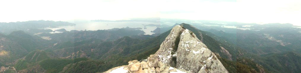 東岩峰の向こうに,対馬の山並みと玄界灘を眺める。