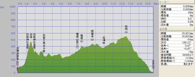 | 白嶽 〜有明山 洲藻登山口〜40分〜鳥居分岐〜35分〜白嶽西岩峰〜20分〜鳥居分岐〜30分〜三角点分岐〜50分〜トンネル上〜35分〜上見坂登山口〜25分〜権現山〜45分〜佐須峠〜25分〜有明山登山口〜20分〜有明山〜60分〜厳原八幡神社 断面図 |