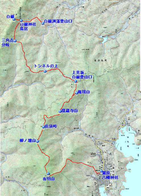 | 白嶽 〜有明山 洲藻登山口〜40分〜鳥居分岐〜35分〜白嶽西岩峰〜20分〜鳥居分岐〜30分〜三角点分岐〜50分〜トンネル上〜35分〜上見坂登山口〜25分〜権現山〜45分〜佐須峠〜25分〜有明山登山口〜20分〜有明山〜60分〜厳原八幡神社 概念図 |