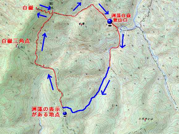 | 洲藻川源流〜白嶽(しらたけ) 洲藻登山口〜25分〜沢分岐〜30分(ルート探しに時間を要す)〜沢からの登り〜60分(伐採のヒノキに四苦八苦)〜 白嶽・上見坂登山道(洲藻表示板)〜45分〜白嶽神社鳥居〜30分〜白嶽西岩峰〜60〜洲藻登山口 (青のルートは道がない部分です。) 概念図 |