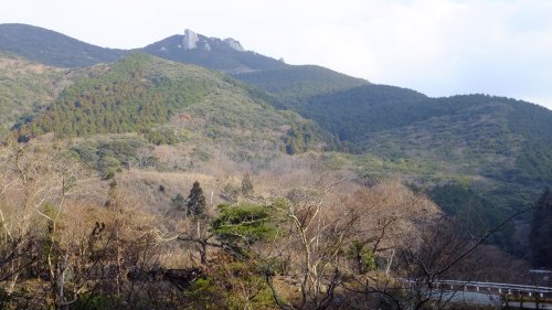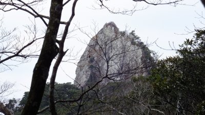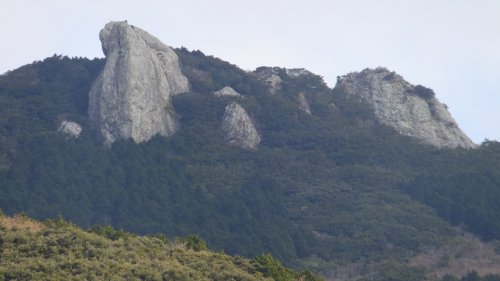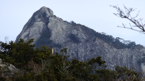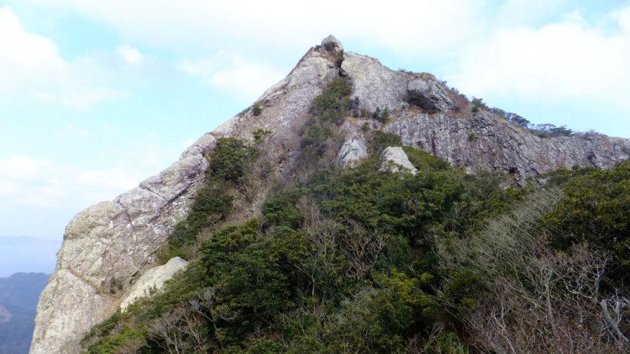 佐須側から鶏知方面に行く道からは、形のよい岩塊が見える。実は白嶽と間違われることもあるのだが、穴ノ壇山の岩峰である。