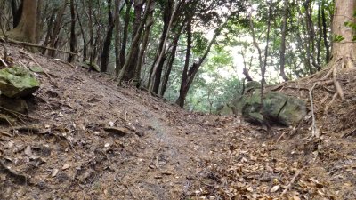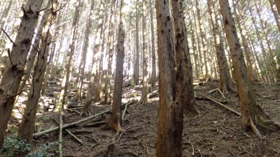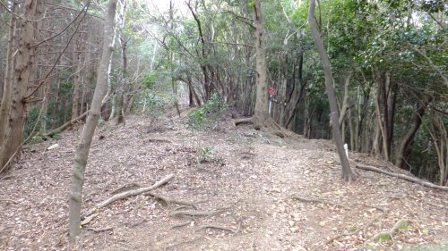 植林帯を登って標高を稼いでいく。そして鞍部に着く。