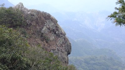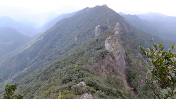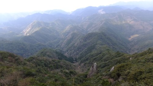尾根に沿ってしばらく歩く、三角点に着いた。ここからの眺めは絶景である。遠くには白嶽西岩峰を望み、東と西には累々とした山並みが続き、近景には尖った岩が迫力ある姿で屹立している。