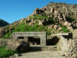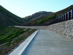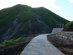 硫黄山への作業道はきれいな舗装と石壁ができていた。