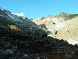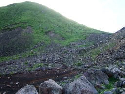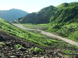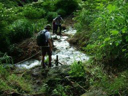 スガモリ越が目の前に来ると,まぶしいばかりの夏の日が射してきた。いやあ,朝といえど日が射すと暑い暑い。スガモリ越からに北千里が浜を通り,法華院山荘を目指す。法華院山荘に泊まった人や坊ガツルでキャンプをしていた方々とすれ違う。楽しい夜と気持ちよい朝を迎えたからだろう,さわやかな笑顔の方々が続く。北千里が浜を過ぎると,大きな沢音が聞こえ出した。登山道も途中で沢にように水が流れていた。砂防堤防の意を介さぬように新たな川の流れができていた。自然の力恐るべし。