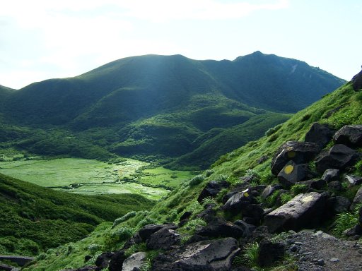 日がまだ射さない道は風も心地よい。歩くことがとても楽しく感じる朝だ。硫黄山に向かう作業用道路は,きれいに整備されていた。三俣山の背後に太陽を感じながら,涼しい道を進む。