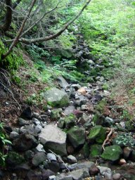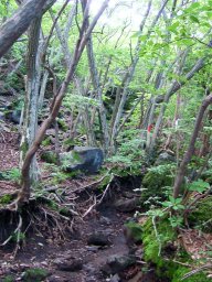 坊ガツルから大船山の登山道へ。この道は,今までの道と違って,林の中を通っていく。溶岩の石が転がり,石ごろごろの中を歩いていく。道も狭く,途中でいくつかに分かれ,また合流を繰り返しながら高度を稼いでいく。