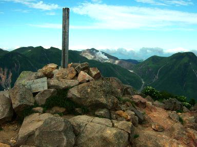 岩場をかけあがるようにして,午前9時,大船山山頂に着く。山頂には2人ほど。遠くまでよく見える。祖母山はもちろん,きっと四国の山だろうか,累々と続く山並みか美しかった。一緒に山頂にいた方は,これから中岳,久住山をめぐり,長者原を戻るという。この暑さの中,すごい人もいるものだ。山頂は風が強く,長袖シャツを羽織らないとくしゃみ連発となる。眺めをゆっくり楽しんで下山する。大船山からの下山路は,石がころころして下りにくそうな印象だったが,歩いてみると,思いの外,歩きやすかった。