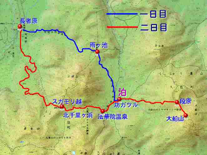 | 1日目 長者原〜65分〜雨が池越〜35分〜坊ガツル(泊) 2日目 坊ガツル〜70分〜段原〜20分〜大船山〜15分〜段原〜50分〜坊ガツル 〜50分〜北千里ヶ浜〜10分(走った!)〜スガモリ越〜80分(硫黄道路経由)〜長者原 概念図 |