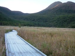 今回は雨が池越から坊ガツルを目指す。そして,大船山往復という一般コースにした。長者原の朝の気温5度。涼しいというか,もう寒いの領域。朝の光を浴びながら自然林の中を進む。まだ歩いている人も少なく静かな道を歩くことができた。登りつめると,雨が池に。ススキがとても美しい。朝日当たって輝いている。雨が池には木道がある。雨の後にはここは木道の下は水たまりになるらしい。