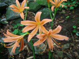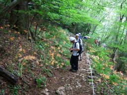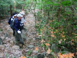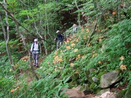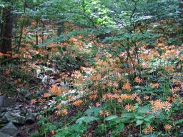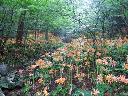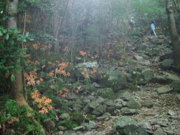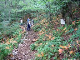 八丁谷林道から登り始める。しばらく歩いて,静かな水場の近くに来ると,おお咲いている,咲いている。オレンジ色の花がまだ陽を浴びていない谷の中に,光るように咲いている。大群落はもっと先だ。ここより美しいはず。期待にまたまた胸が膨らんだ。