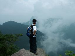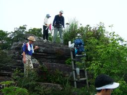 いつもの倍以上の時間をかけて座禅岩に着く。今日はガスがかかり,眺めはよくない。それでも時々吹く風が心地よかった。座禅岩にたたずむごえもんさん。岩の立つとこの人が絵になる。先日白馬に登り,三郡縦走をやったのち古賀まで歩いて帰る超人である。すごい人なのだが,とても気さくな好青年。一緒にいるだけとうれしくなる。肉まんさんは去年,このコースののち経ヶ岳まで歩いたらしい。この暑さの中,この人もやっぱりただものではない。