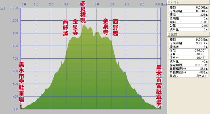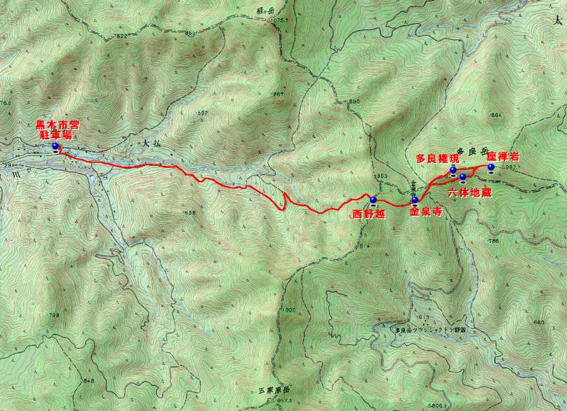 黒木市営駐車場〜西野越〜金泉寺〜多良権現〜座禅岩〜六体地蔵〜金泉寺〜西野越〜黒木市営駐車場