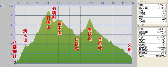 八幡神社〜1時間30分(清水山経由)〜有明山〜50分〜竜本山〜50分〜