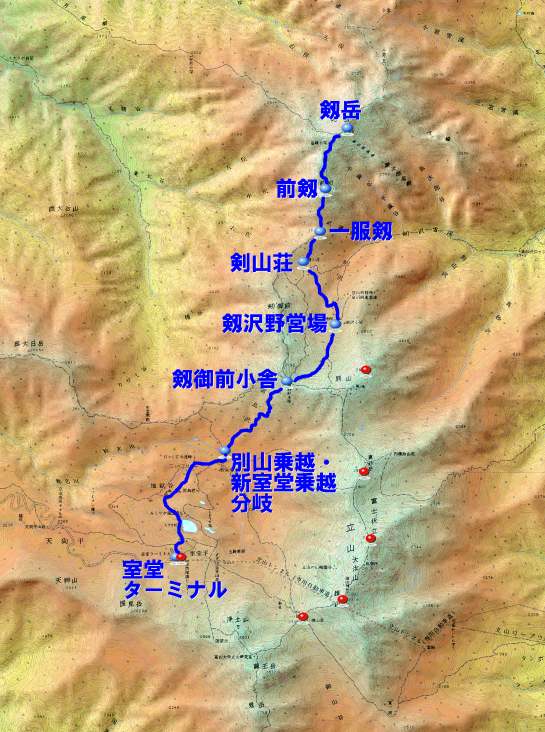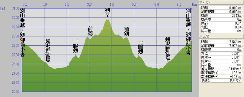 | 断面図 行動日 2日目 約8時間 剱御前小舎〜30分〜剱沢野営場〜40分〜剣山荘〜20分〜一服剱〜40分〜前剱 〜30分〜カニのタテバイ〜30分〜剱岳 〜15分〜カニのヨコバイ〜30分〜前剱〜30分〜一服剱〜20分〜剣山荘 〜30分〜剱沢野営場〜30分〜剱御前小舎(剱御前小舎泊) 歩く標高差累積1000m、歩行距離約8km |