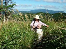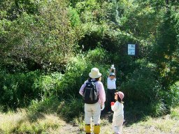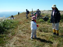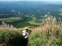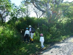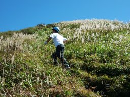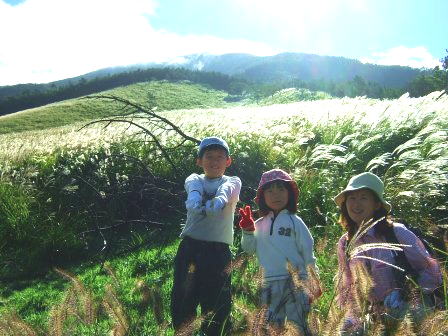 かやとススキの道は粘土質で湿っていて滑りやすい。2年前は11月,今日は10月。かやとススキの背がまだ高く,娘は大変だ。しかし,登るに連れて,素晴らしい眺めが見えてくる。2年前は四苦八苦した道は,なんなく登り終えた。子ども達の成長をつくづく感じる。